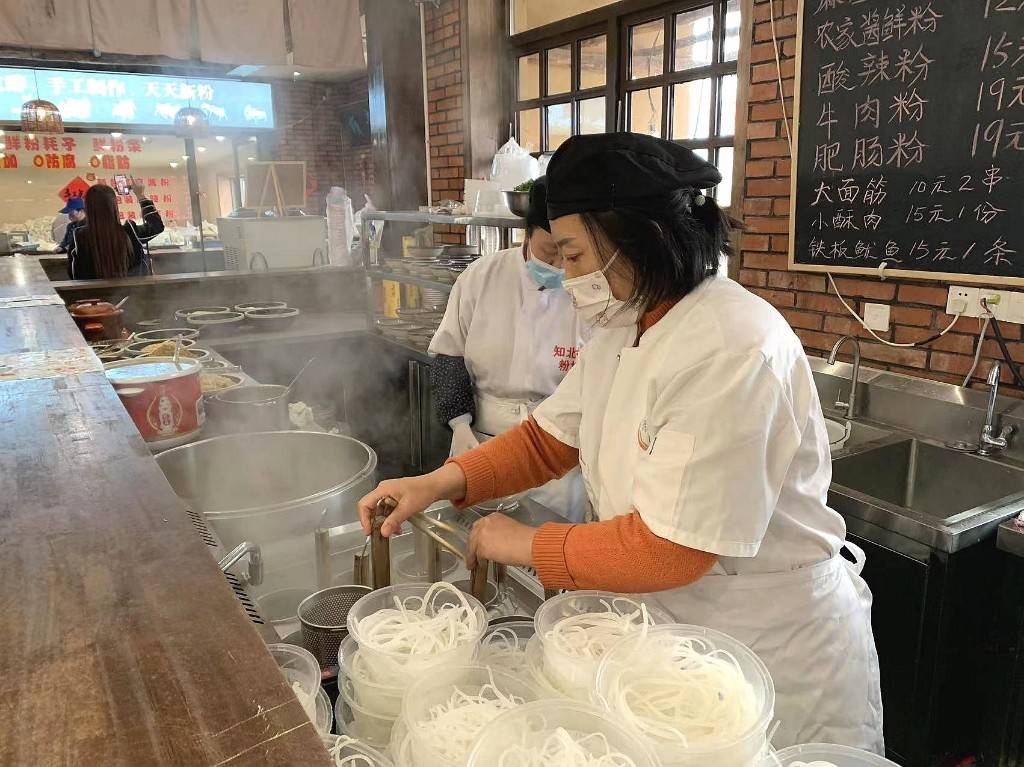 据了解,知北村粉坊采取“前店后厂”的商业模式,2022年7月开业,占地3000平方米,分为生产加工区、库房区、餐饮区和销售区。每天生产需消耗2万斤土豆,生产粉条1000斤,不仅为当地居民提供了就业岗位,还给土豆种植户增加了经济收入。从开业至今,吸引了大量省内外游客前来旅游打卡。春节黄金周期间,梅河口知北村粉坊最高日接待游客1万多人,卖了1500碗粉儿,日销售额达10万元。
