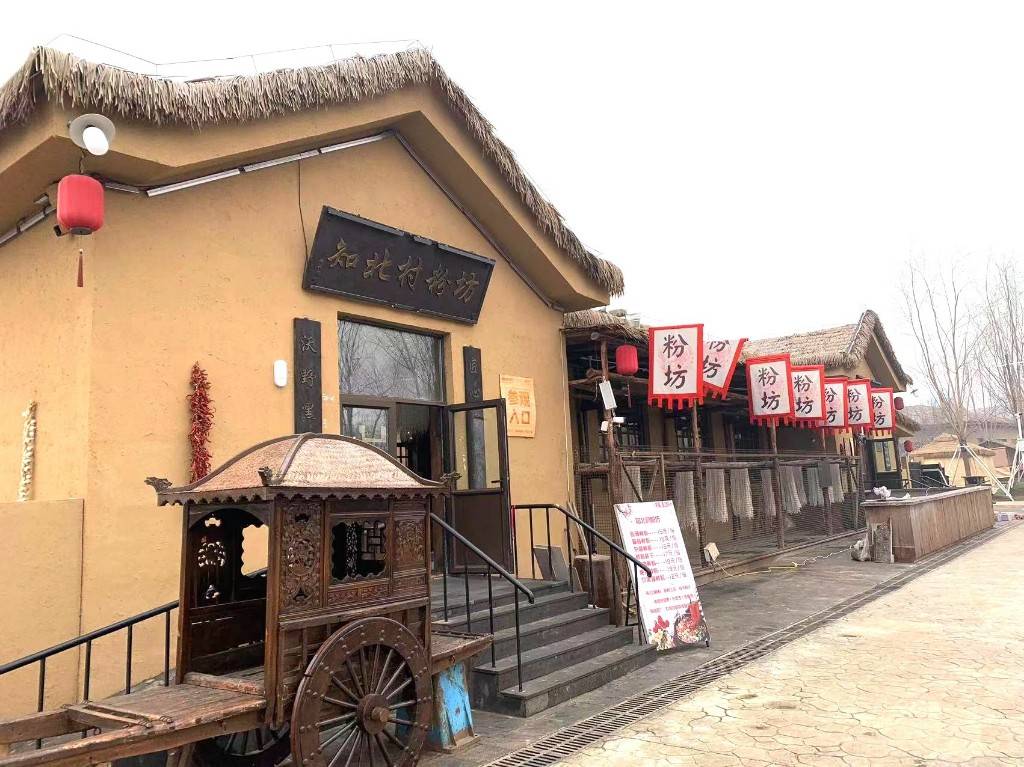 稻草苫的房顶,黄泥夯的土墙,房檐下挂着的大红灯笼和粉坊旗号随着春风轻轻舞动,很多游客都被知北村里这座具有古朴气息的传统手工作坊所吸引,怀着好奇的心情走进去参观。