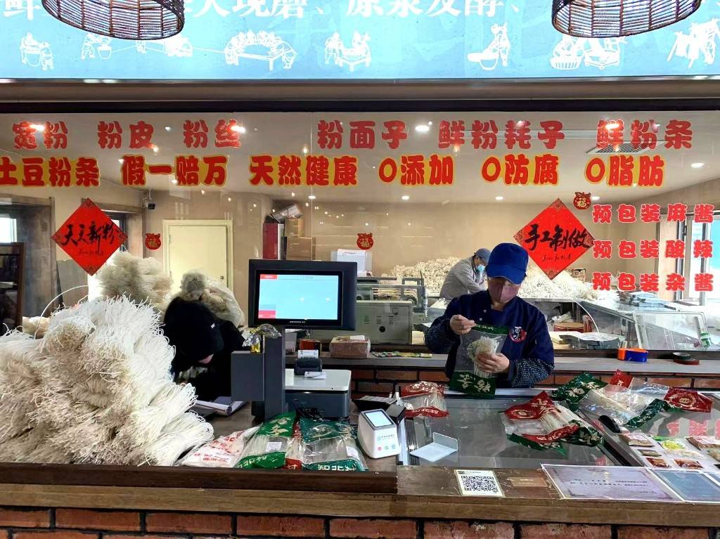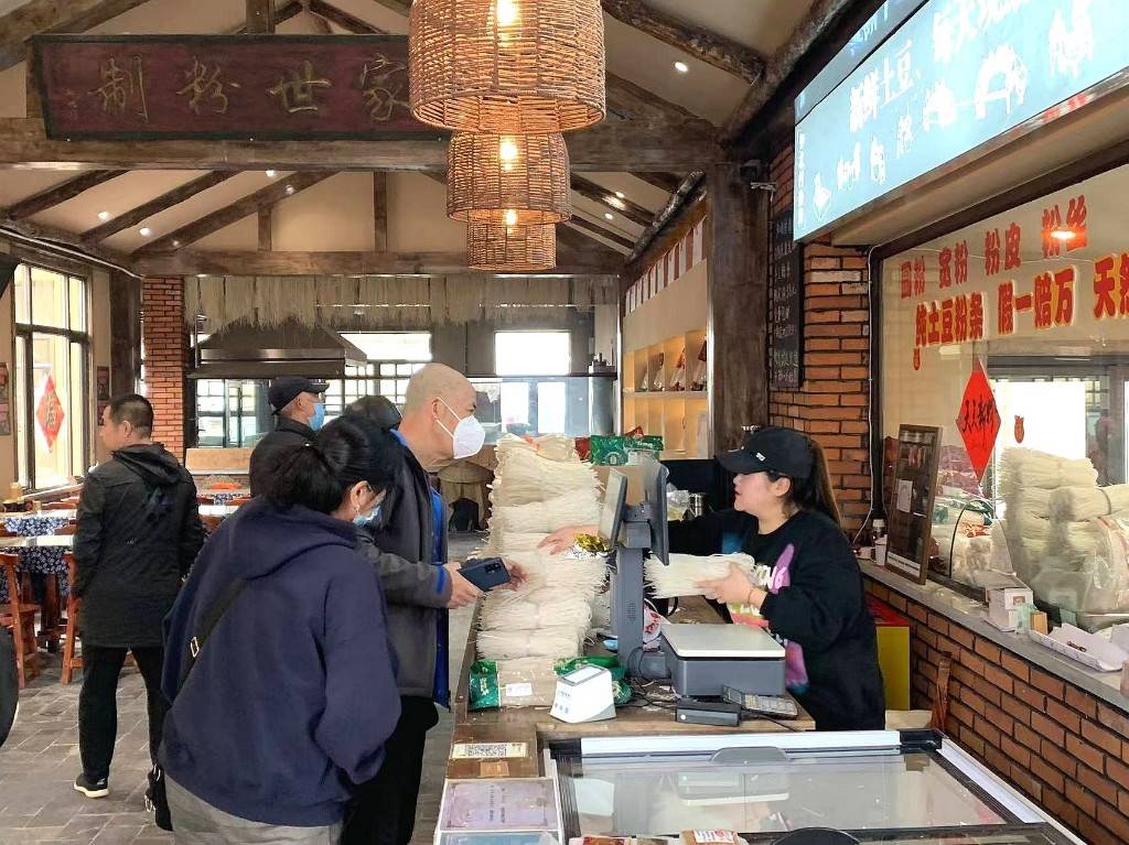 参观完毕后,有的游客会到餐饮区去买一碗酸辣粉,尝尝手工粉条的老味道;有的游客则到销售区,买一捆手工粉条,作为来梅河口旅游的“伴手礼”。