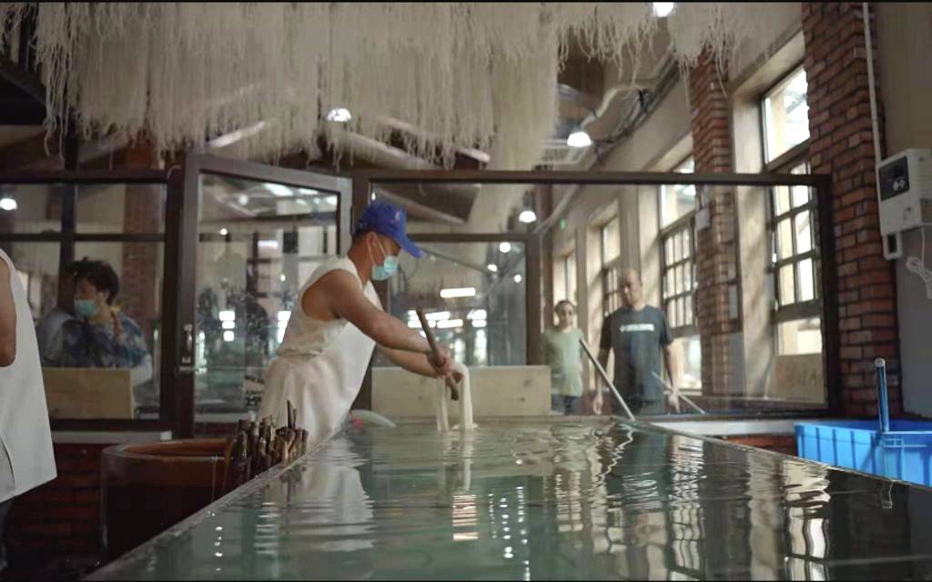 今年43岁的宋长富是这家粉坊的总经理,祖上三代都是当地出色的漏粉工匠。记者看到,在作坊里有20多名师傅正在紧张有序地忙碌着,有的在洗土豆,有的在磨浆,还有的在过浆分离。一旁的大锅冒着腾腾热气,随着漏粉师傅有节奏地拍打漏勺,白色粉浆变成缕缕丝线滑入滚水当中,顷刻间变成粗细均匀且具有韧性的粉条……