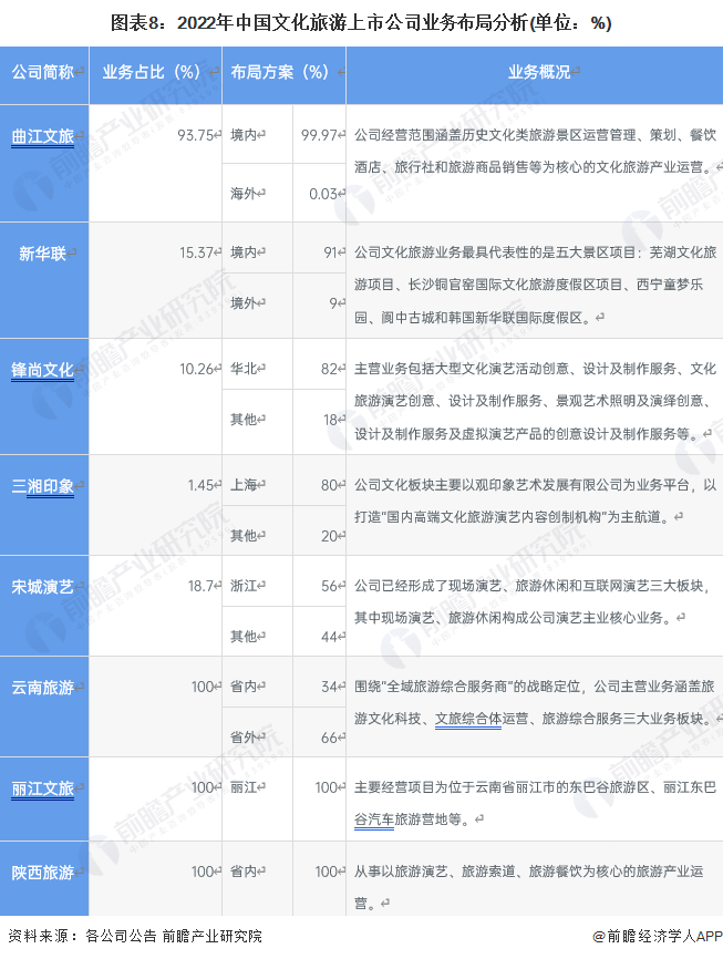 在中国文化旅游行业的发展中,曲江文旅、新华联作为文化旅游领域的主要企业,在业务规模、业务范围方面拥有较大的优势。从整体行业上市企业布局来看,企业大多聚焦境内。