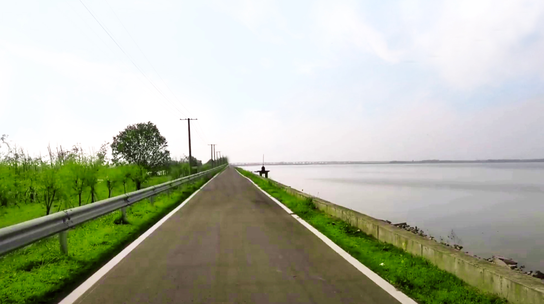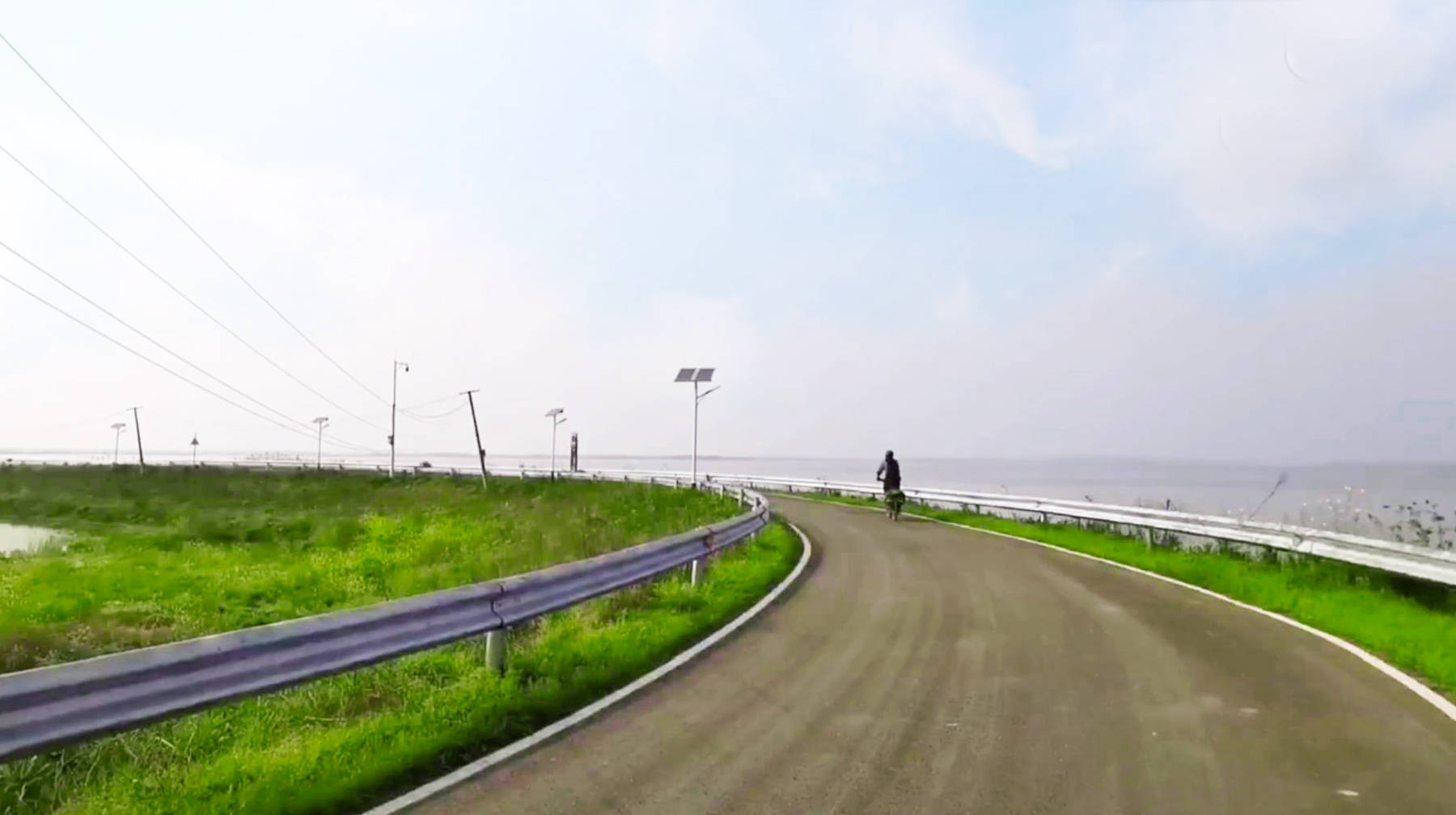 穿过养殖的区域,鲁湖绿道来到了前面的水上公路部分。说是水上公路,但在小编的认知里,它更像是沉降的路基和漂浮的木桩混合的填充物。这一段路面并不宽,左右全部临着湖面,从起点开始,它也并非直线,而是有一定的弧度。骑行的人,在路面两边走,可以近距离看到水岸的状态,一沉一降,看似有反差,但实际是湖水冲刷的结果。至于自驾的人,几乎是全程加速,慢悠悠晃过,看不到水面和路基交界处的变化。