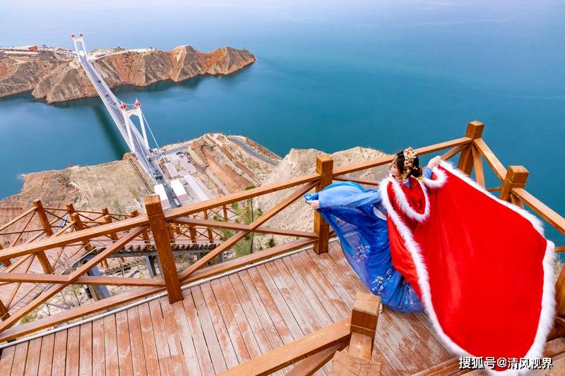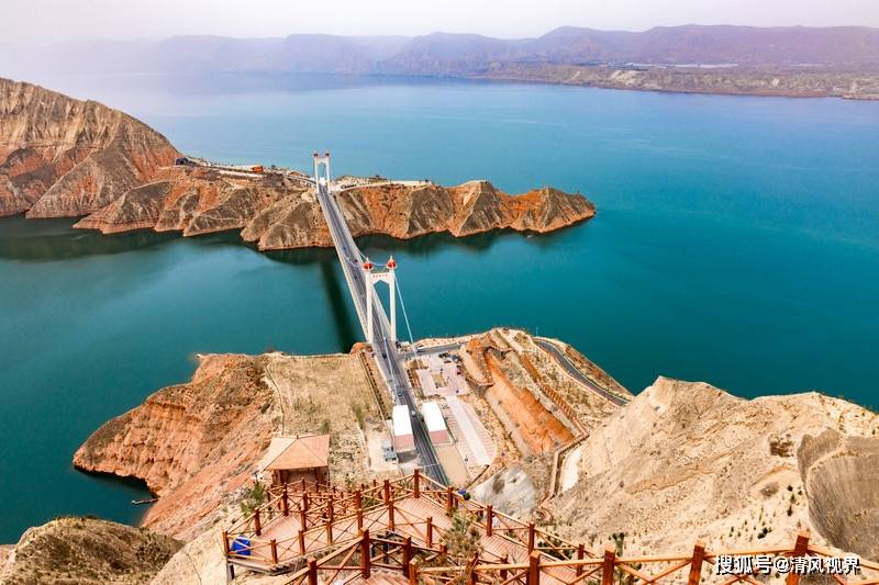 站在东乡奔驰沟观景台上可以鸟瞰整个库区和大桥的美丽景色,放眼望去,蓝天白云,丹霞碧水,时有快艇、轮船驶过,划出一条长长的水波,使库区变得灵动了起来。