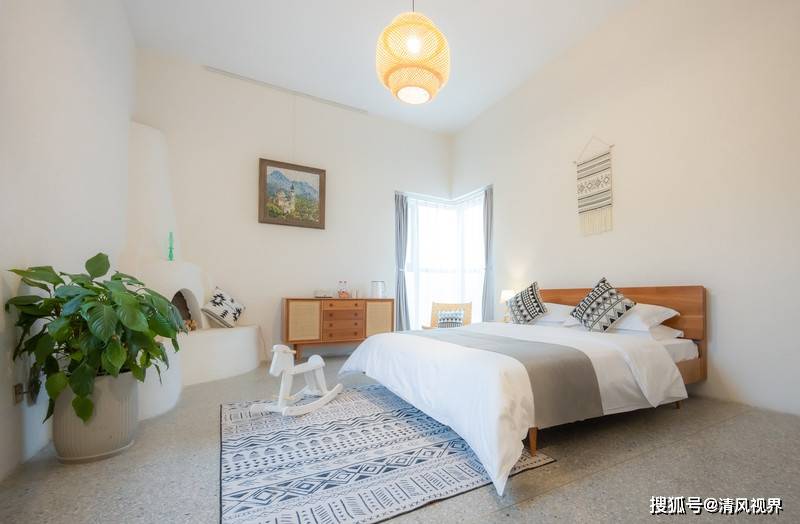 宿白色的墙面,最大限度上呈现了日光投射出的丰富色彩与变化多端,每间房子朝外的一角都有一个大大的落地窗,让居室的内部空间与院落和风景连接为一体。