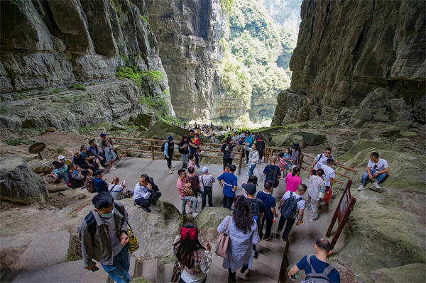 游客们沿着蜿蜒的石板小路前行,雄奇险峻的三桥,一步一景、步步奇观,视线之内,苍翠青绿的草木、潺潺飞溅的流水……一下就折服了游客。“以前我在电视上听说过武隆,这次有机会随团来武,满眼山清水秀,空气好,非常好玩,我非常喜欢。”来自北京的张先生惊喜的表示。