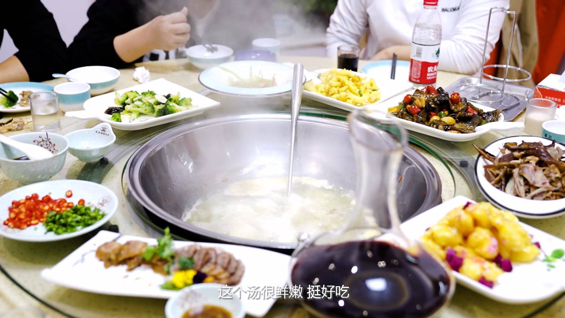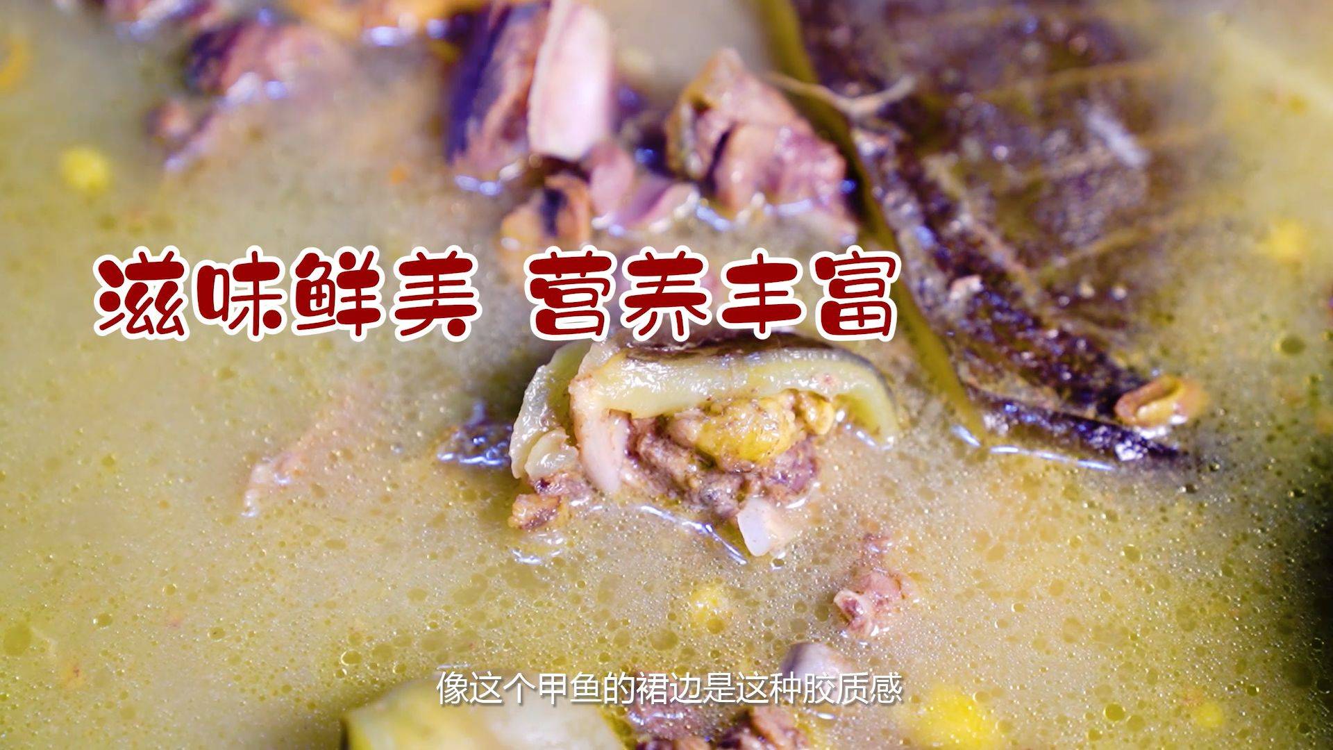 主持人:刚刚这火焰甲鱼真的是很有仪式感啊,像什么腰子啊,鸽子啊,鳝鱼啊都可以往里面加,吃完这一顿,绝对大补。这个甲鱼肉是非常有嚼劲的,像这个甲鱼的裙边是这种胶质感,QQ弹弹的很好吃,点赞!