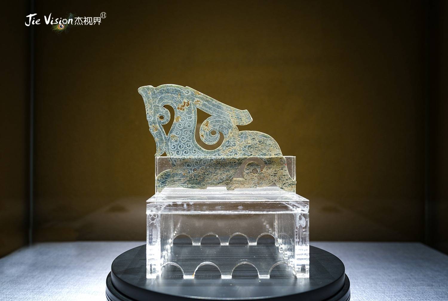 这件馆中的镇馆之宝是汉代的“夔龙青玉饰件”,它出土于重庆奉节永安镇遗址,“夔龙青玉饰件”全长17.5厘米,高11.5厘米,它表面光洁滑润,龙作垂首屈身状,双面雕刻,遍体以隐起手法雕饰勾云纹,立体感极强。好多朋友会问,什么是夔?什么又是夔龙?“夔”最早记载于山海经中,传说是一种形状如牛,长着青灰色的身子,善于游水,且游水时伴有狂风暴雨,后被誉为龙的一种。以“夔”为样子绘制的纹路叫作“夔龙纹”,是战国和汉代时期常用的一种纹饰。