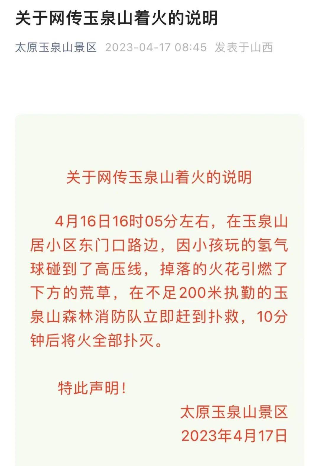 4月17日,山西太原玉泉山景区发布《关于网传玉泉山着火的说明》称,4月16日16时05分左右,在玉泉山居小区东门口路边,因小孩玩的氢气球碰到了高压线,掉落的火花引燃了下方的荒草。