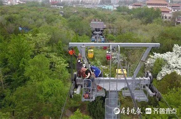 4月13日,济南千佛山景区,来自泰安的专业人员在空中检修登山索道。