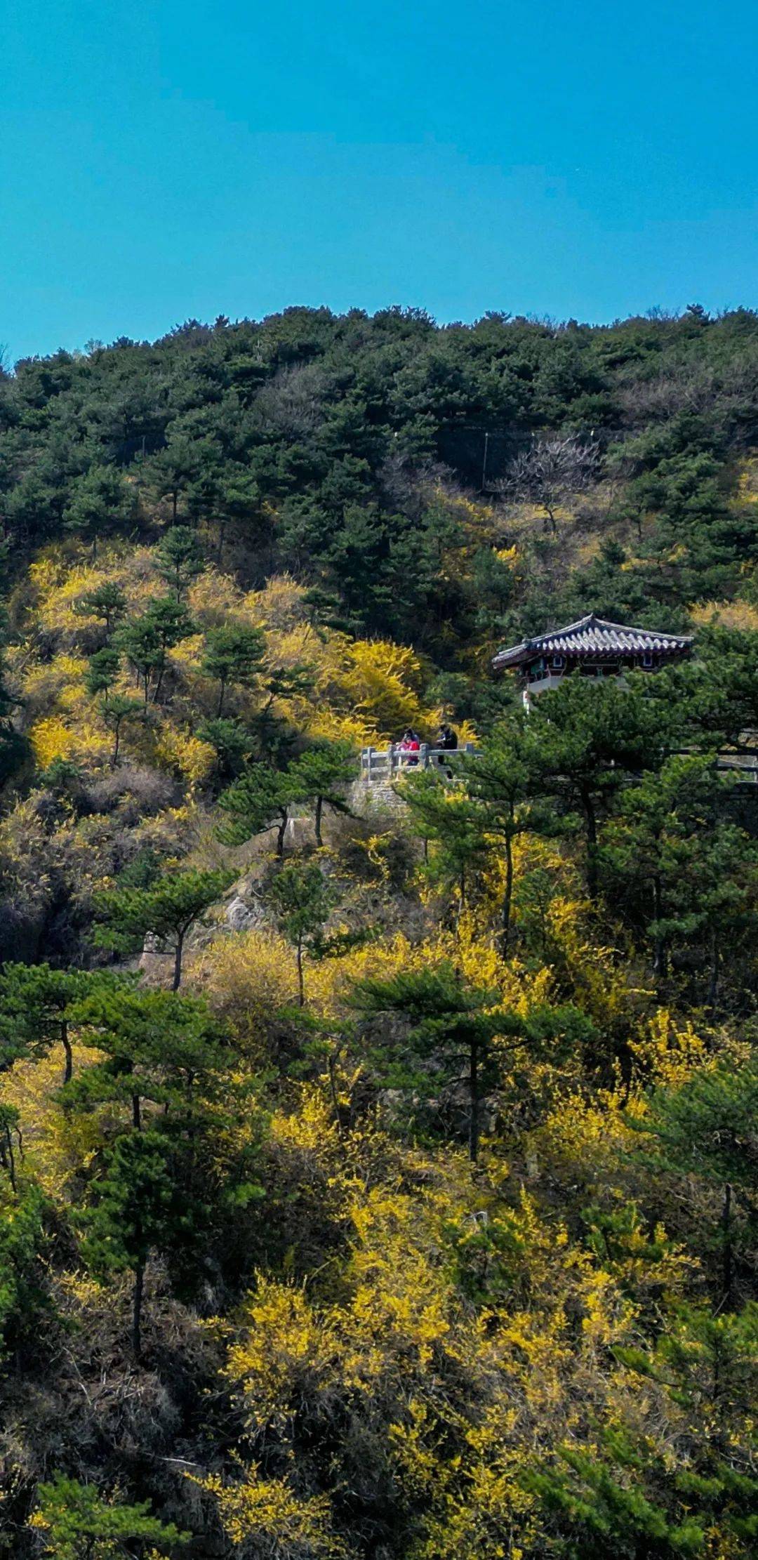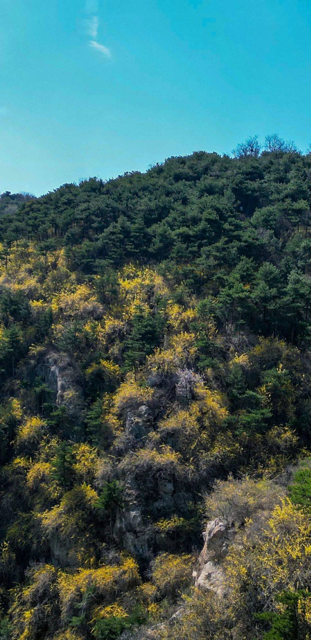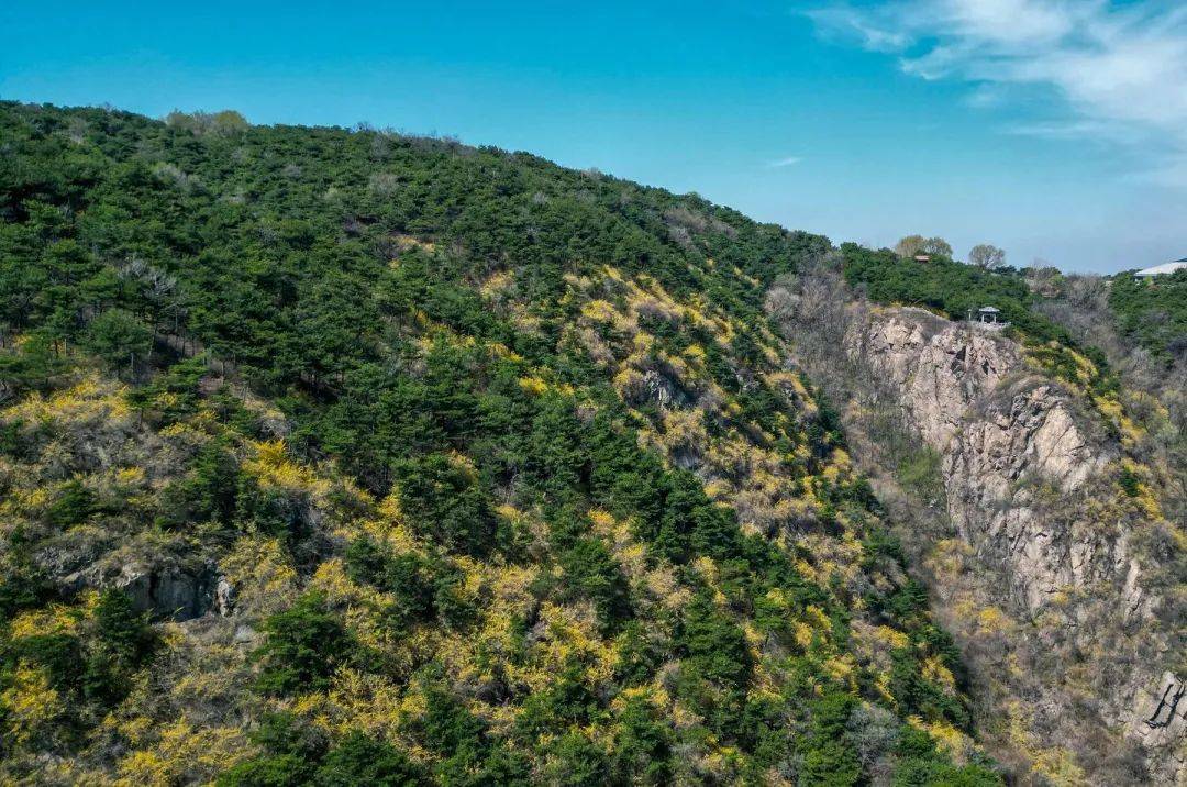 在陡峭的山壁之间,连翘依旧笑迎春风。悬崖峭壁丝毫不妨碍她开得靓丽,尤是在春日乏绿的山野间,这一抹明黄直接点亮周山,一山的花团锦簇,一山的鲜艳明媚。