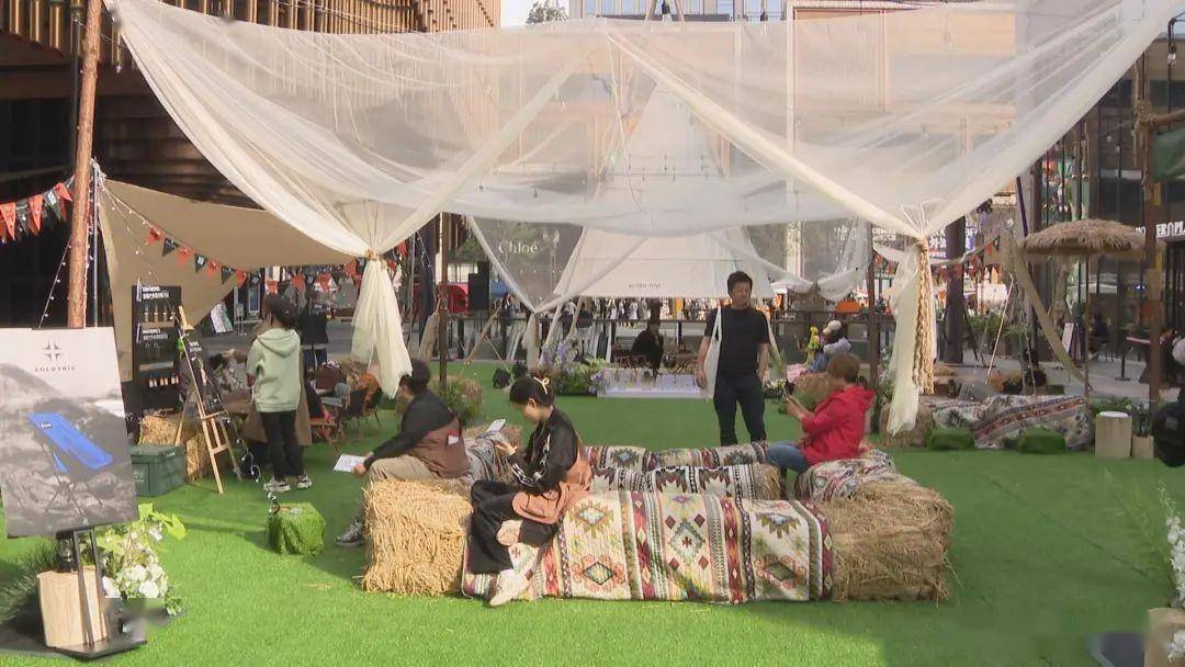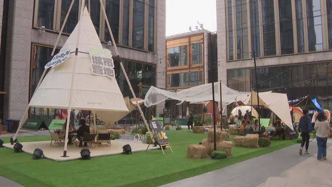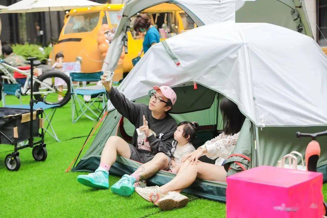 在BFC北区广场搭建的绿色人工草坪上,支起了十来顶大大小小、款式各异的帐篷,帐篷里头,露营桌椅一应俱全,帐篷周围还挂满了露营灯,显示出一番浪漫的景象。草坪的中央则堆满了稻草,让人仿佛置身郊野乡村,不少市民纷纷在稻草堆上休憩,拍照打卡。在一旁的野营小帐篷内,大人们躺在里面沐浴阳光,小朋友们嬉戏打闹,享受自由、轻松的午后美好时光。