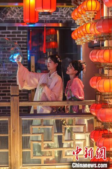 日落西山,记者步入万寿宫历史文化街区看到,众多身着汉服的游客簇拥在巨型花束、花潮舞台、鲜花电话亭等陈设前拍照打卡,人流如织。