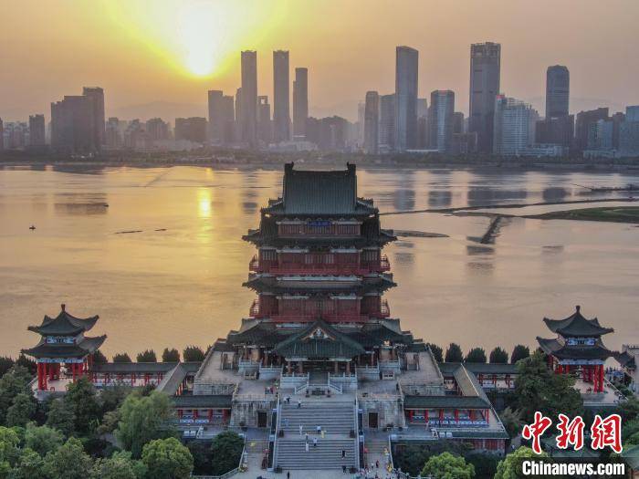 图为4月15日,航拍傍晚时分的滕王阁,与不远处的落日、赣江、高楼共同构成了一幅美丽画卷。 刘力鑫 摄