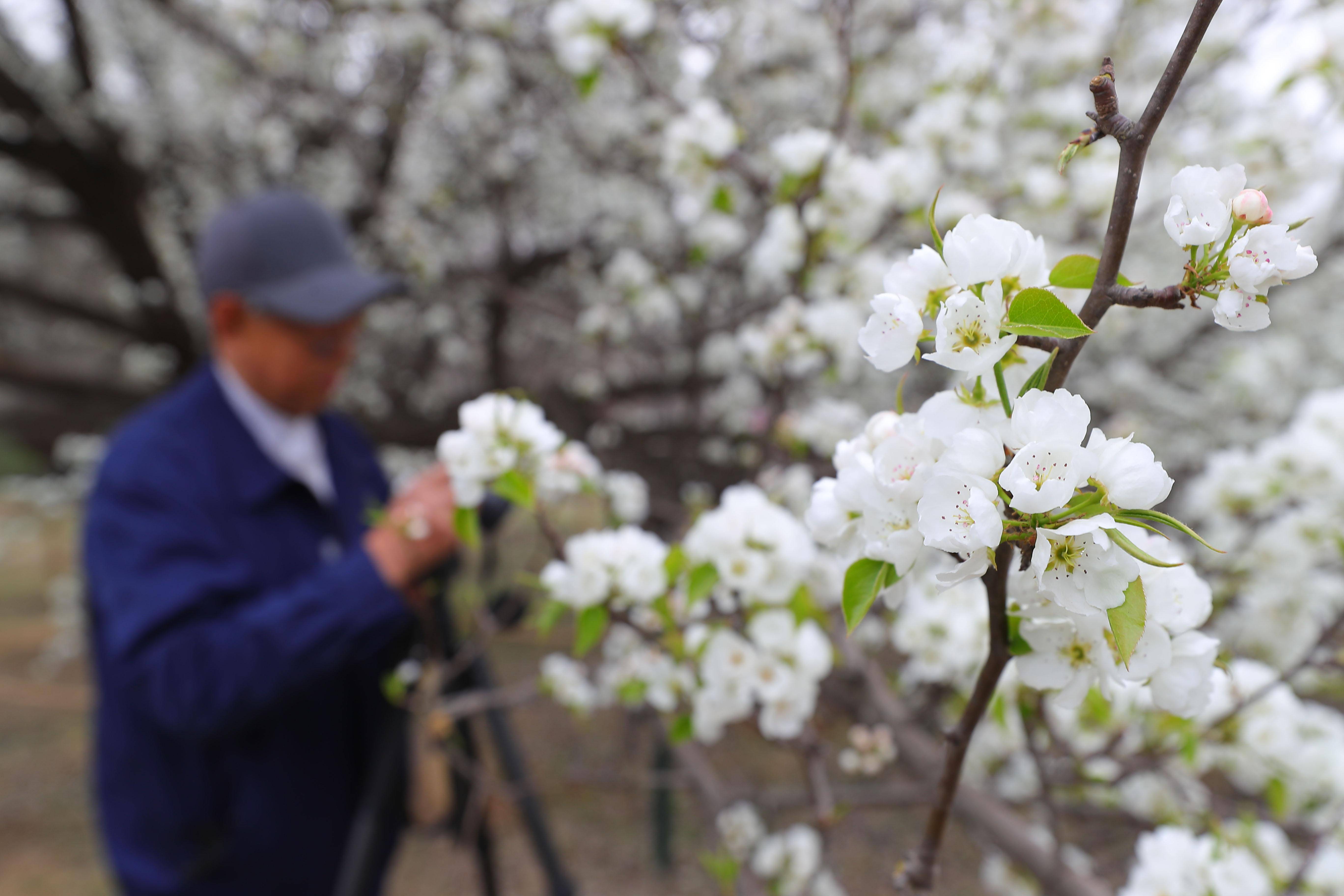 4月17日,摄影爱好者在拍摄梨花。 新华社记者 杨青 摄