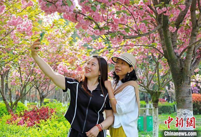 市民在樱花海中穿梭,享受惬意的春日好时光。 何清海 摄