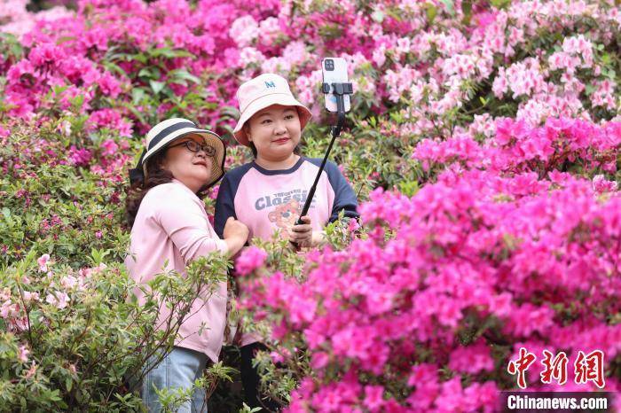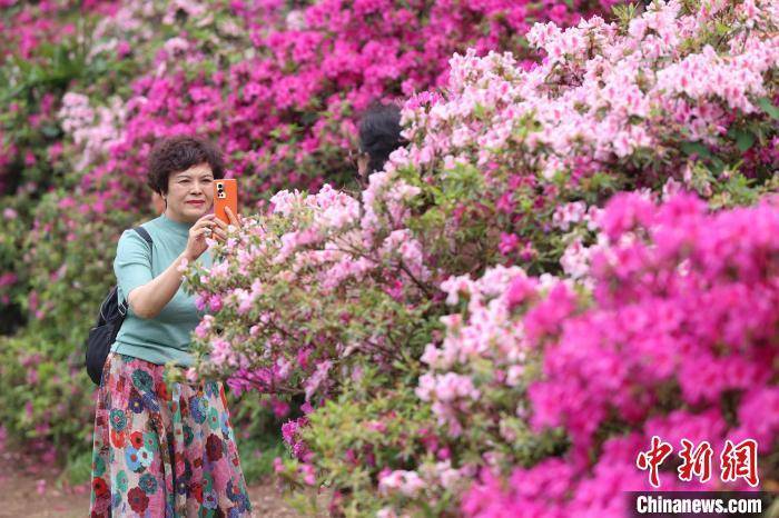4月17日,市民在杜鹃花丛中自拍。 瞿宏伦 摄
