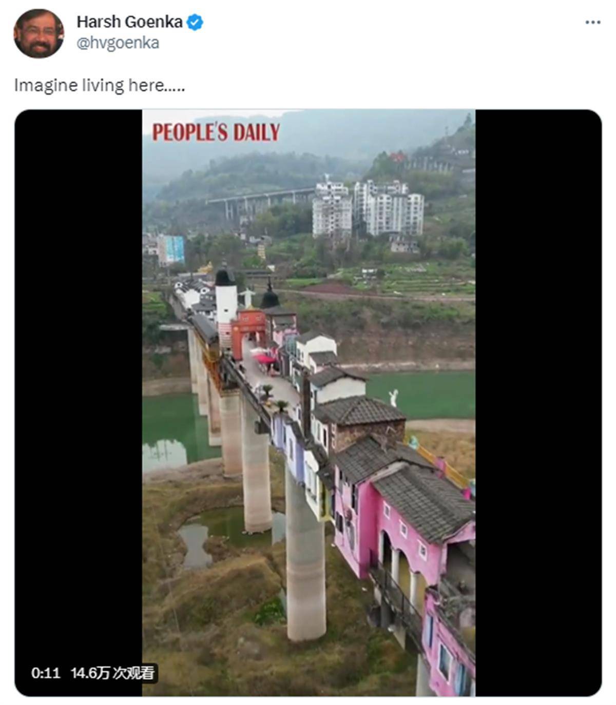 4月15日,印度RPG集团的总裁哈什·戈恩卡在推特上转发了中国媒体的一段视频,并发文:“难以想象住在这儿。”视频显示了中国一座桥上小镇的景象。