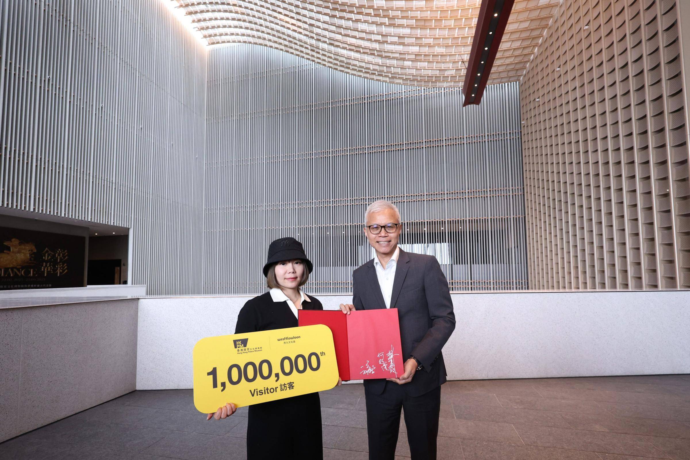 4月17日上午,香港故宫文化博物馆迎来第100万名参观者。香港故宫文化博物馆馆长吴志华于博物馆西中庭迎接第100万名参观者,并向其赠送纪念品。