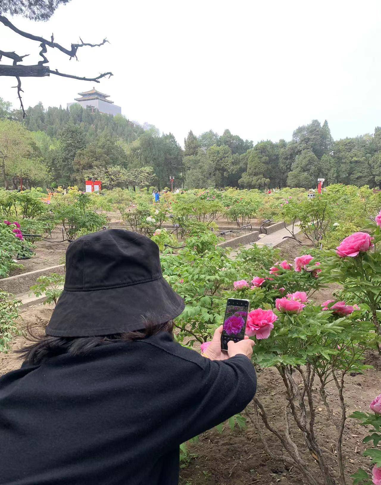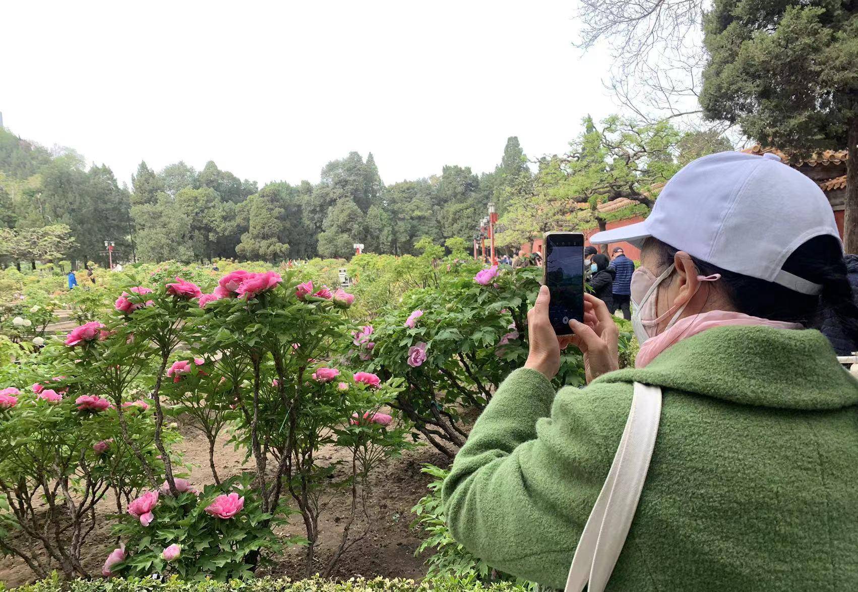 上午10点多,景山公园东门牡丹园,白色、黄色、粉色、紫色……颜色、花型各异的牡丹已陆续绽放,雍容华贵,与红墙绿瓦的皇家园林相得益彰。花圃前,游客们举着手机、相机拍下一幅幅繁花盛景。