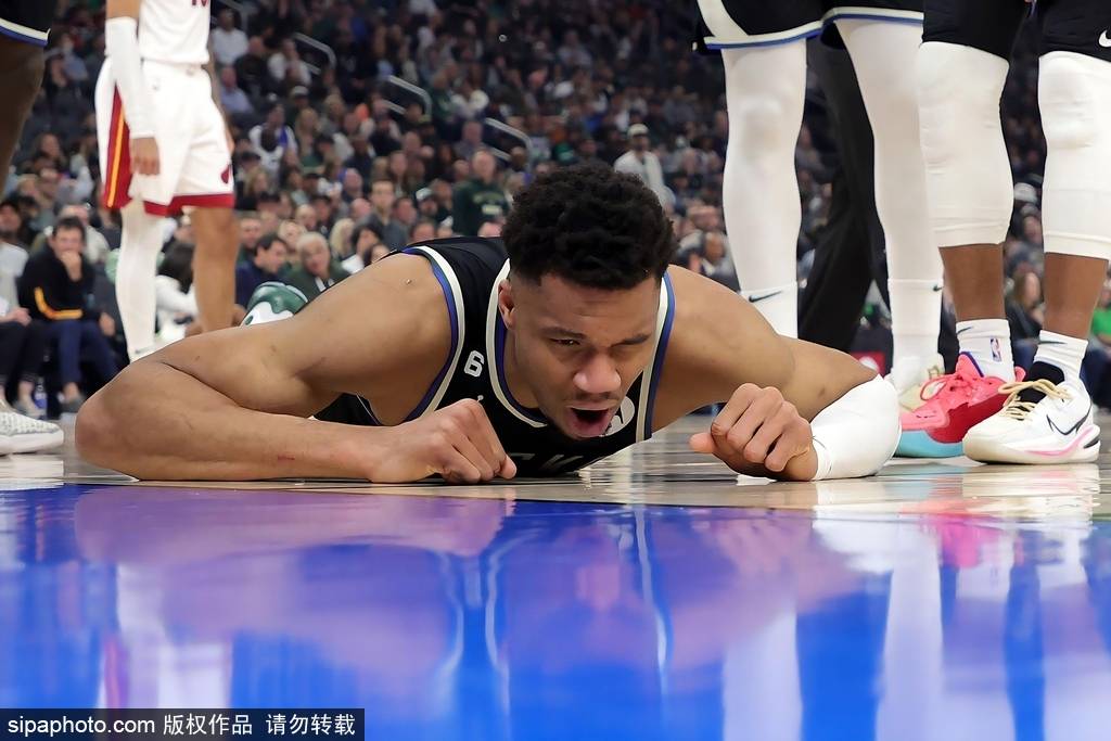 NBA季后赛,雄鹿不敌热火。图为字母哥重摔在地,背部受伤