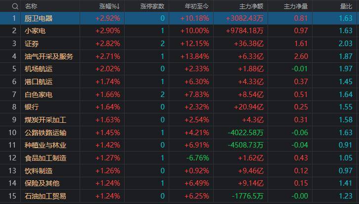 从板块上看,厨卫电器、小家电、证券板块涨幅前三,领涨的板块是今年以来表现相对落后的板块,两市共有20个行业涨幅超过1%,传媒、互联网电商、计算机应用板块跌幅前三,近期强势板块全线走弱,共有10个行业跌幅超过1%,板块表现相对稳定。
