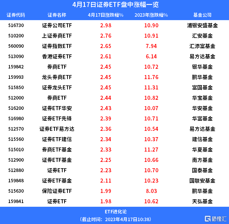 ETF方面,浦银安盛证券公司ETF、汇安上市券商ETF、易方达香港证券ETF、华宝券商ETF等涨超2%。