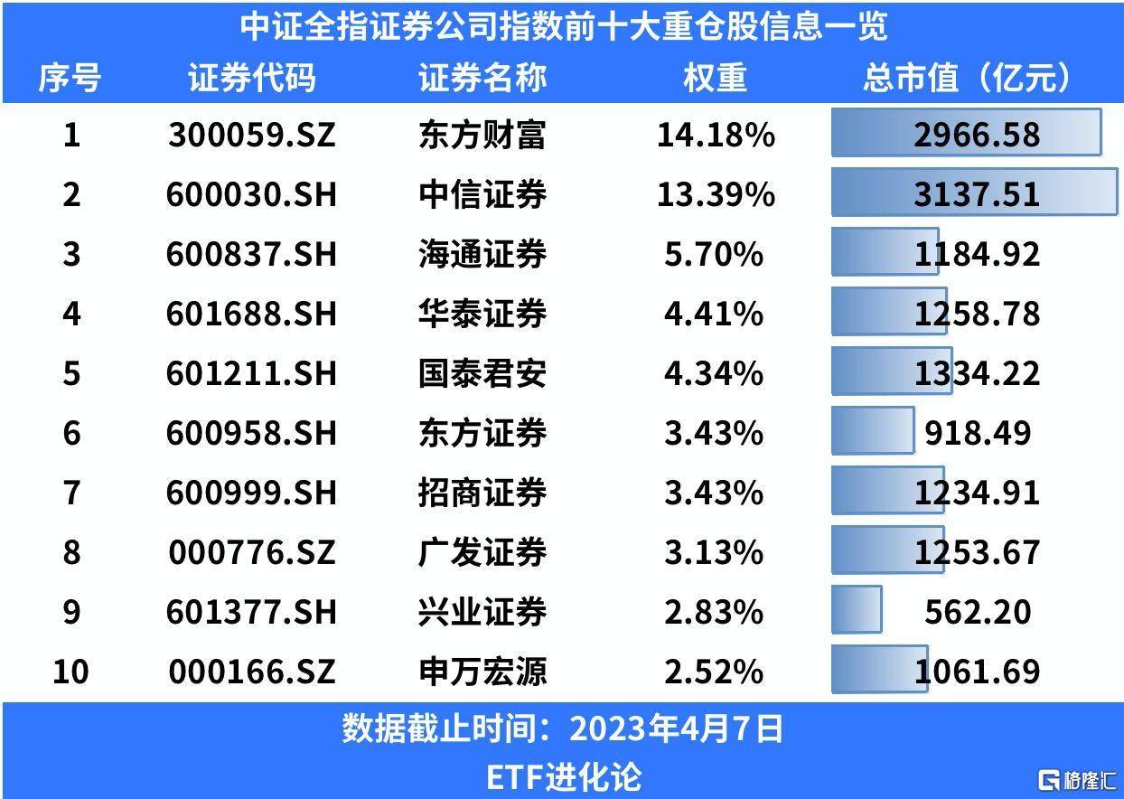 中证全指证券公司指数成分股共49只,前十大重仓股中共有8家市值超千亿的证券上市企业,包括东方财富、中信证券、海通证券、华泰证券、国泰君安等等。其中,东方财富和中信证券合计权重高达27.58%。