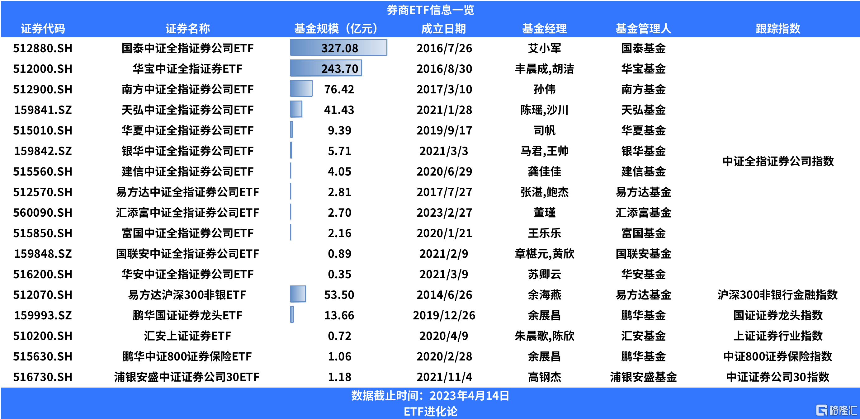 目前市场上共有17只券商相关ETF,其中规模最大的是国泰中证全指证券公司ETF,规模高达327.08亿元。该基金成立于2016年7月26日,是最早一批成立的券商ETF,该基金跟踪中证全指证券公司指数。