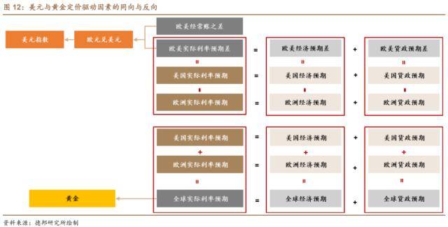 作为人类文明史上最古老的货币,黄金的定价权不会由一国100%控制。因此,在以实际利率预期为核心的传统投资框架下,黄金的定价权应在全球而非仅在美国手上。图12展示了一个理想化的投资环境,即假设全球仅有美国与欧洲两个经济体,那么欧、美两经济体中的实际利率预期之和决定全球实际利率预期进而影响金价,其实际利率预期之差则决定欧元兑美元汇率进而影响美元指数。