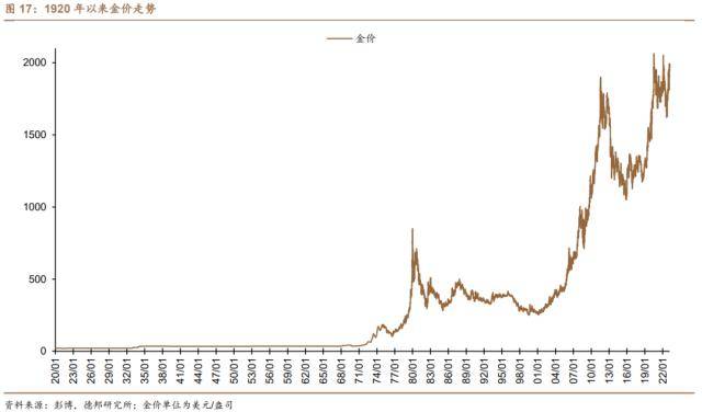 ·策略启示。货币属性回归不常有,但对金价是长牛。黄金货币属性10年多的沉默导致市场形成了对实际利率预期定价黄金走势的固有思维,而10年多的震荡市也让许多投资者认为2000美元/盎司或是黄金的顶部而非底部。但纵览金价百年历史,其指数型的上涨均有一段由金融属性主导的较长的震荡市,待到货币属性回归时,2000美元/盎司的旧周期顶部区间或构筑为新周期的底部区间。