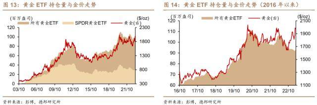 事实上,2022年10月以来,黄金ETF的持仓量与金价走势也发生了背离(图14),体现为金价上涨的同时,黄金ETF持仓量却在持续下降,即推动金价上涨的不再是对纸黄金的需求,而是货币属性的回归。