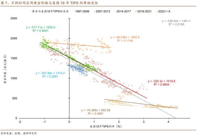 虽然1997年以来美国10年TIPS对黄金的解释力度高达81.96%(图6),但从走势上可知(图5),二者走势曾多次出现分化。进一步地,我们将美国10年TIPS与黄金价格的相关性切分为5段时期,可以发现TIPS对金价的解释力度两极分化:2007-2013年、2018-2021年两个时期的解释力度极强,R2分别高达86%、96%,而剩余时期的解释力度从未超过50%。