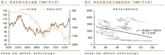 由于黄金交易主要由美元计价,因此市场投资者常用美元来衡量金价强弱。在强美元、弱黄金的框架下,市场常以美元指数表征金价,进而衡量其对金价的影响。但从1997年以来的周频数据来看,二者的走势也并无明显的相关性(图1),美元指数对黄金价格的解释力也仅有10.78%(图2)。