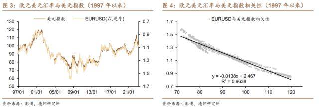而美元指数则是金融美元的表征。我们在贵金属系列的首篇专题《黄金买点渐近——贵金属研究框架系列一》中提到,美元指数参照1973年3月六种货币对美元汇率变化的几何平均加权值,而其中欧元占比最高(57.6%),因此美元指数的变化几乎与欧元美元汇率一致(图3)。从1997年以来的相关性来看,二者的相关性高达96.38%(图4)。