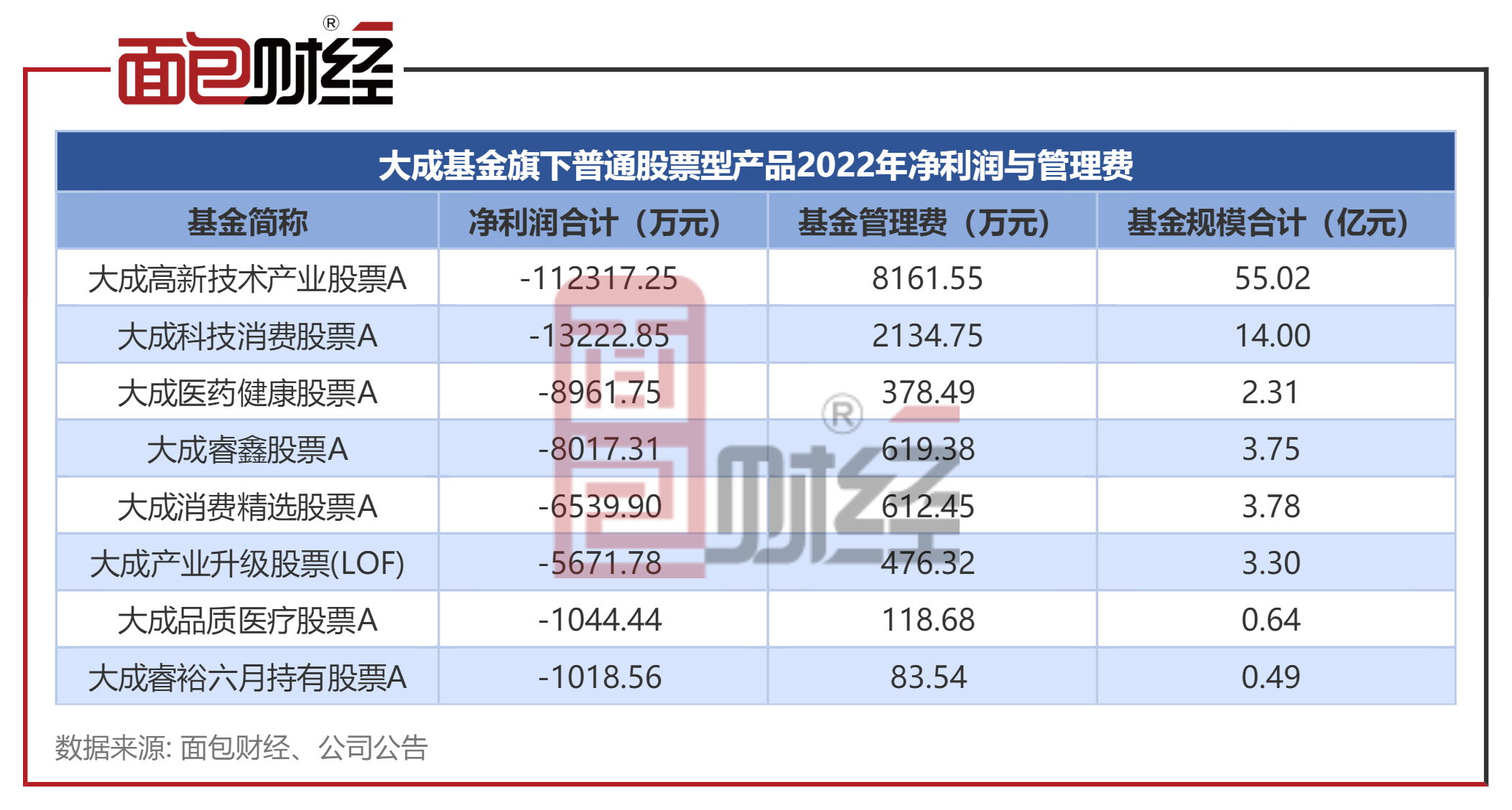 2022年,大成高新技术产业股票单只产品亏损11.23亿元,占8只产品总亏损额的71.63%;期间,该产品收取管理费8161.55万元,占管理费总额的64.85%。