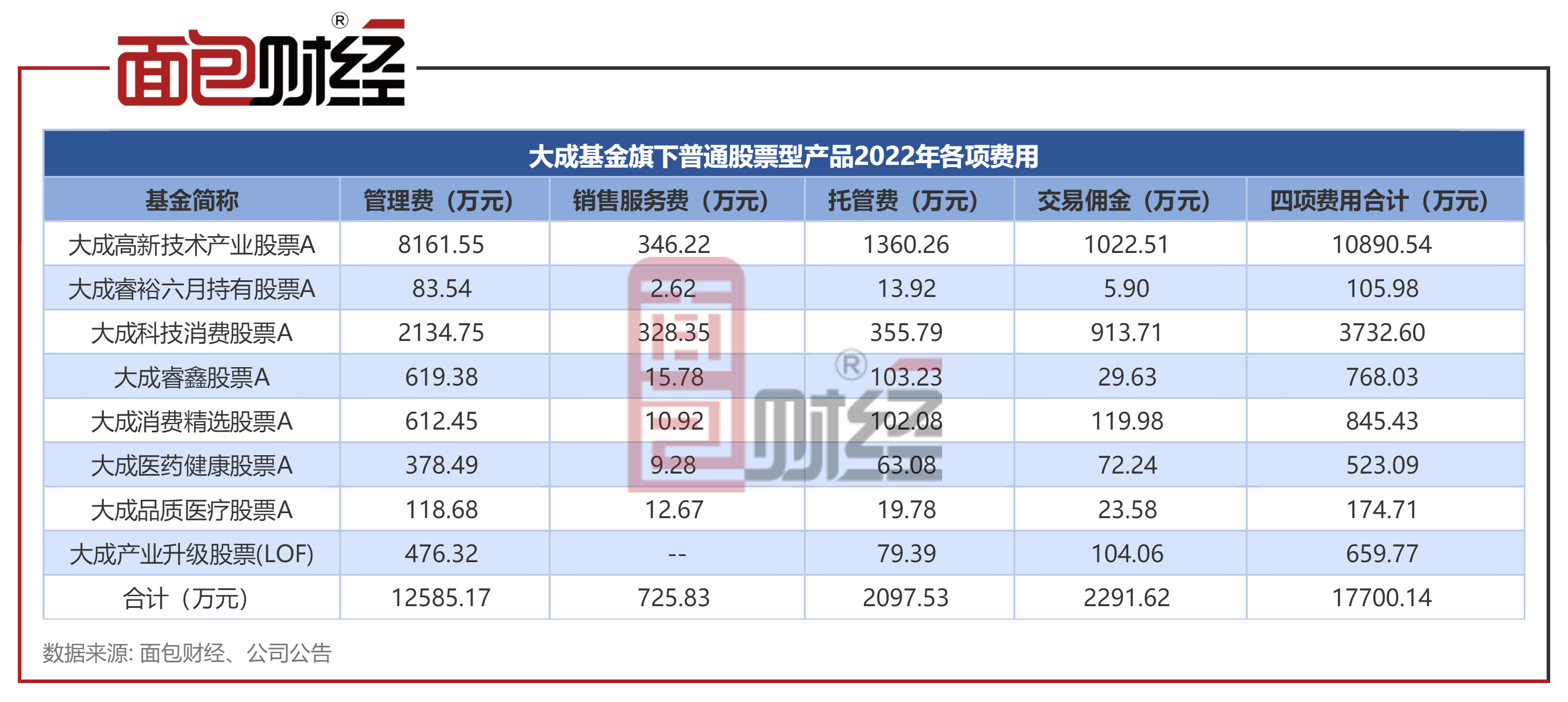 费用方面,大成基金旗下8只股基2022年除了1.25亿元的管理费,还产生了725.83万元的销售服务费、2097.53万元的托管费、2291.62万元的交易佣金,四项费用合计超过1.77亿元。
