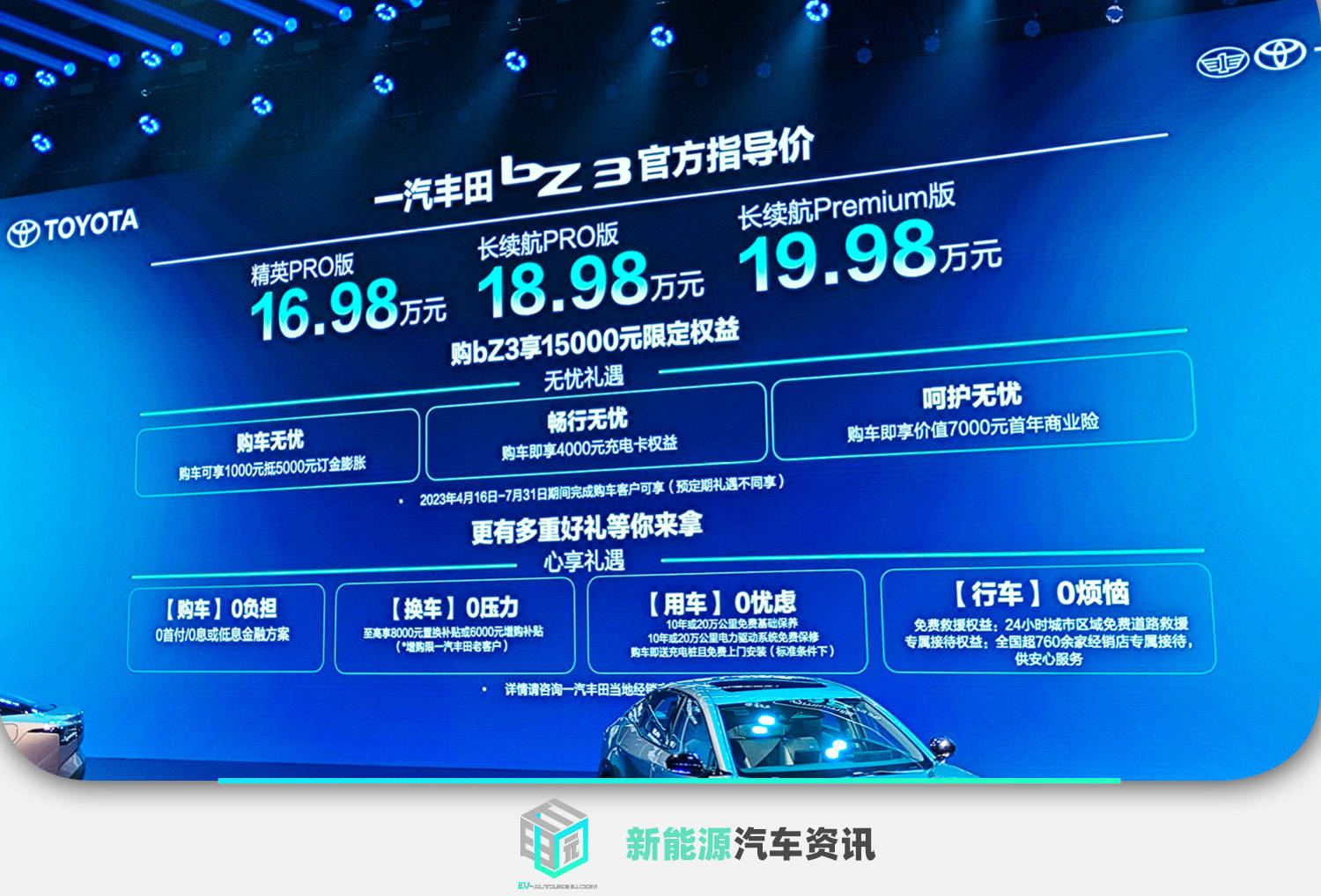 2023上海车展开幕前夕,一汽丰田bZ3正式上市并开启交付。新车共推出3款车型,售价为16.98-19.98万元。新车定位为中型纯电动轿车,采用比亚迪旗下的弗迪电机和磷酸铁锂电池,CLTC工况续航最高达到616km。