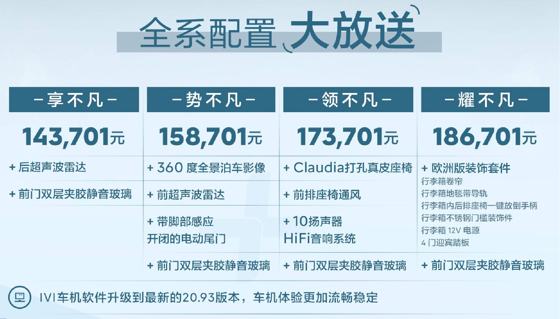 作为年度改款车型,新车在售价上增加了1元,但配置提升较多。具体包括:全系标配福耀3.96mm双层夹胶静音玻璃;此外,享不凡增配后超声波雷达;势不凡增配 360度全景泊车影像+前超声波雷达,后摄像头设置有清洗功能,带脚部感应开闭的电动尾门;领不凡增配Claudia打孔真皮座椅、前排座椅通风、10扬声器HiFi音响系统;耀不凡增配欧洲版装饰套件,包含后备厢卷帘、地毯带导轨、后排座椅一键放倒手柄、不锈钢门槛装饰件、12V电源。此外,新车的车机软件升级到了最新的20.93版本,车机体验更加流畅稳定。