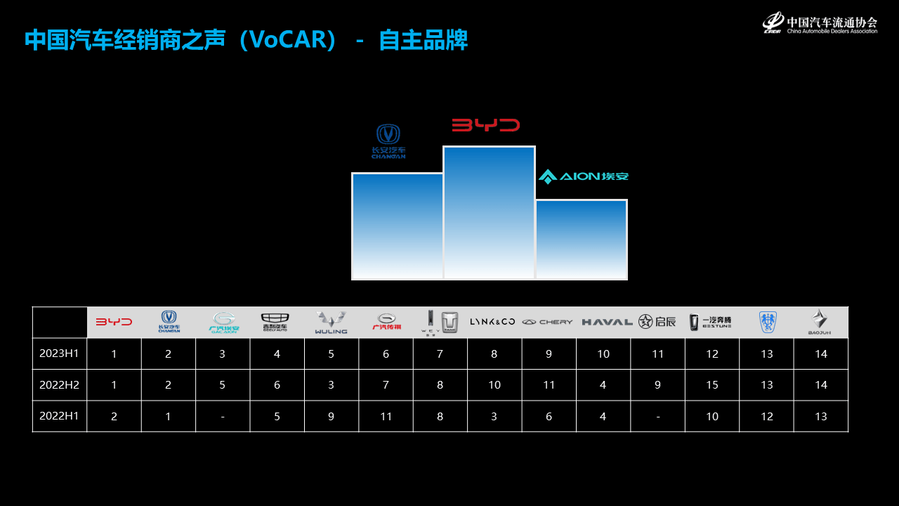 自主品牌来看,比亚迪品牌经销商满意度和信心度最高,2022年销量增速迅猛,主要得益于产品力的提升,渠道的大发展。长安汽车排名第二,表现也十分亮眼。排名第三的广汽埃安品牌,受益于新能源产品的销量增长,排名相比去年有明显提升。