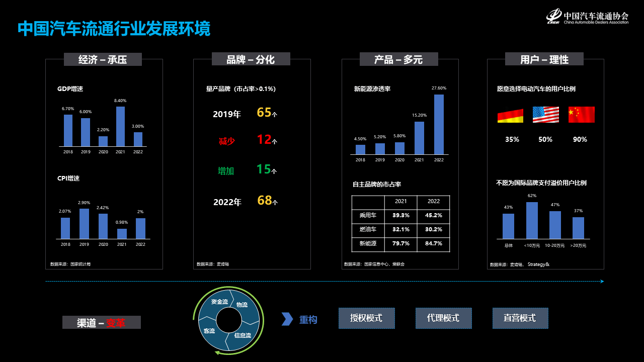 叠加这些外部环境的变化,中国汽车流通市场的渠道模式也在发生变化,这其中通过资金流,客流,信息流,物流的重构,除了传统的授权模式,新的代理模式和直营模式也出现了,汽车流通体系也出现了新的业务主体。