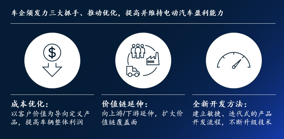 首先是成本优化,以客户价值为导向定义产品,提高车辆整体利润;其次是价值链向上游、下游延伸,扩大价值链覆盖面;最后是使用全新开发方法,建立敏捷、迭代式的产品开发流程,不断升级技术。