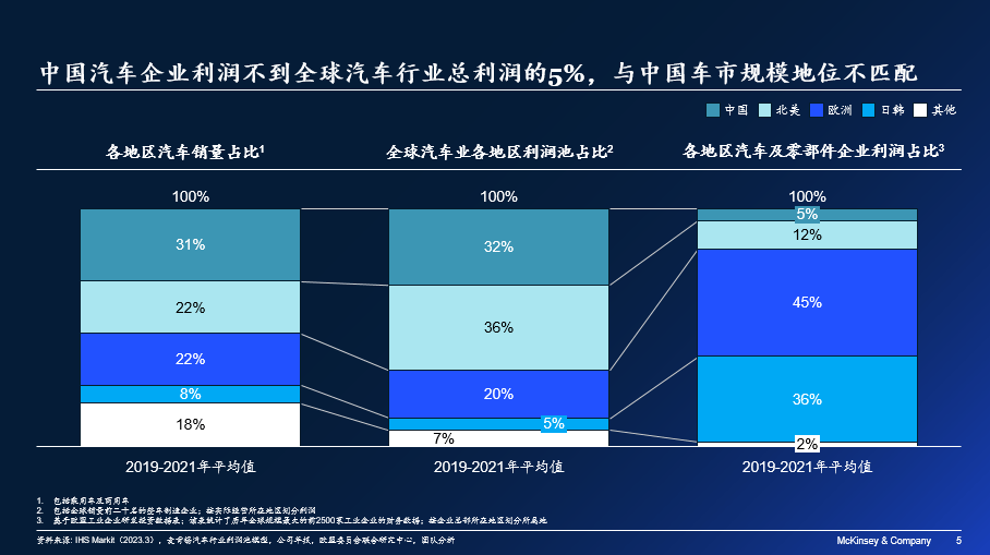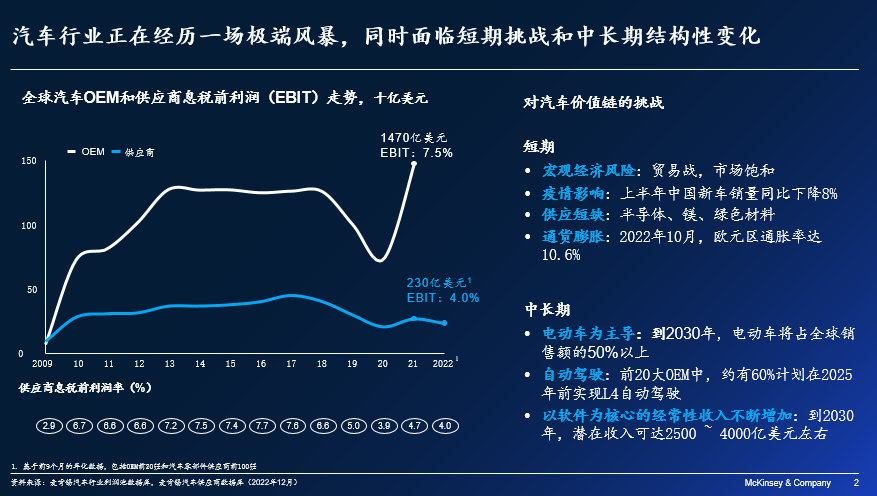 会上,麦肯锡全球董事合伙人方寅亮进行了题为“回归价值,行稳致远——汽车行业如何突破盈利困局”的演讲。方寅亮认为,过去的2022年,汽车行业几乎是资本市场上受创最为严重的行业,正在经历一场极端风暴,同时面临短期挑战和中长期结构性变化。目前中国汽车企业利润不到全球汽车行业总利润的5%,与中国车市的规模地位极不匹配,汽车价值链遭遇挑战。