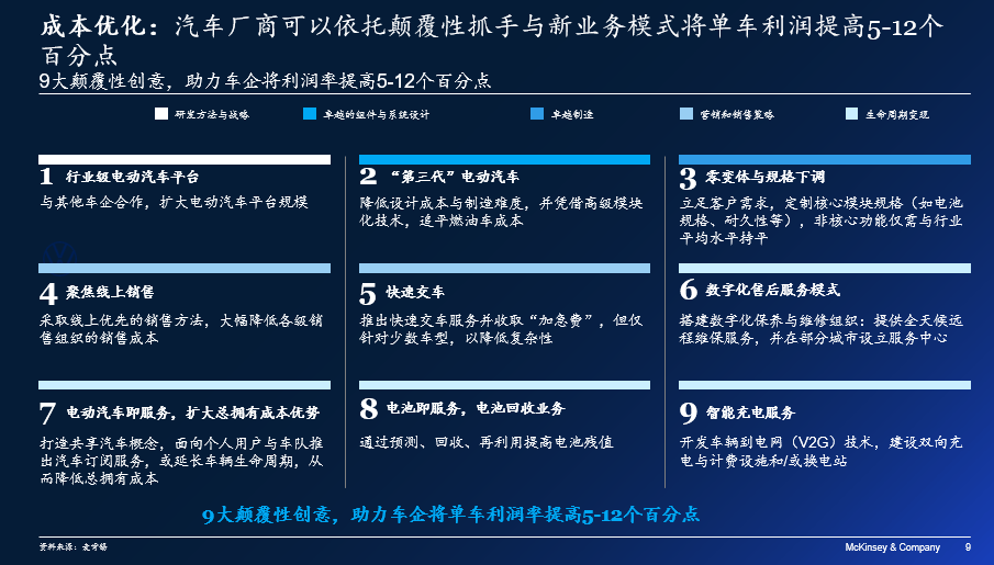 这几年,全球主流OEM利润的改善、提升,是以供应商巨大的成本压力,以及非常高的降本要求作为代价的。真正产业的可持续发展,不能完全通过挤压供应商生存空间获取。因此,我们提出九大颠覆性创意,助力车企将单车利润提高5-12个百分点。
