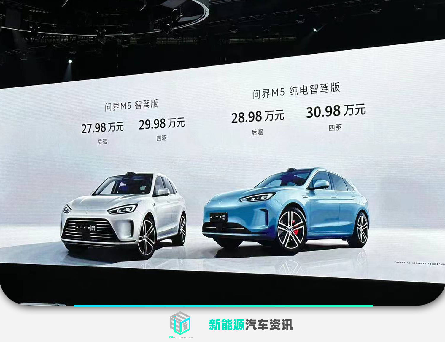 2023年4月17日,上海车展开幕前夕,AITO问界M5高阶智能驾驶版正式上市,新车共推出两种动力形式共4款车型。其中,M5智驾版 后驱售价27.98万元,四驱售价29.98万元;M5 纯电智驾版 后驱售价29.98万元,四驱售价30.98万元。
