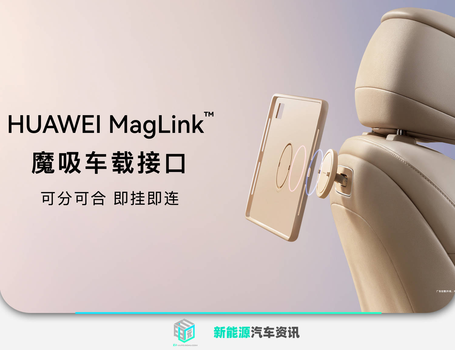 内饰部分,新车在主副驾驶座椅椅背侧新增“HUAWEI MagLink”魔吸车在接口功能,支持27W充电,可实现前后排互动、可拆可合、即插即连、充电等多种功能。