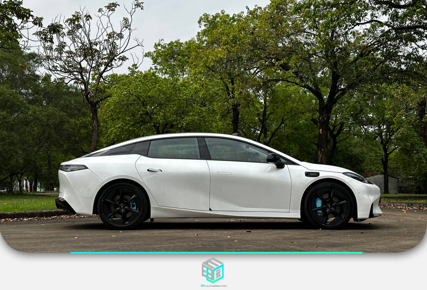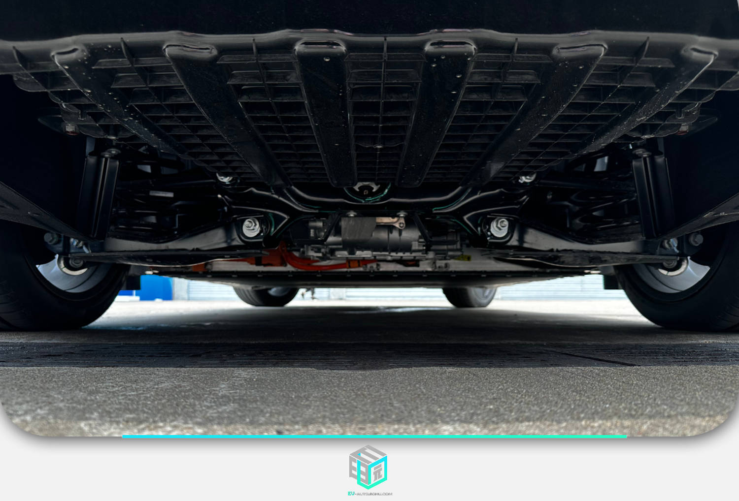 车头下方的主动式进气格栅采用两片主动式风刃,可以在散热系统需要时主动启闭。在中高配车型上前排还配备了剪刀门,车尾配有三段式主动尾翼,可以在时速大于100km/h时主动开启。轮胎采用米其林转为纯电车开发的竞驰EV系列,针对纯电车的加速特性有更好的抓地性能,较低的滚阻能兼顾续航里程,静音配方也能最大限度降低路噪。四轮的刹车卡钳都被涂成了蓝色,前刹车卡钳为对向四活塞。