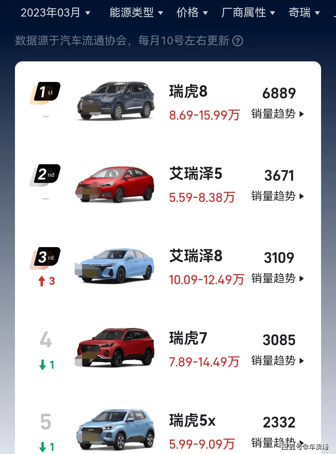 车卖场查了一下第三方销量统计数据,奇瑞汽车今年前三个月每个月全系车销量加起来也就两万左右,连比亚迪海豚一款车单月的销量都不及,所以奇瑞还有什么可吹的呢?
