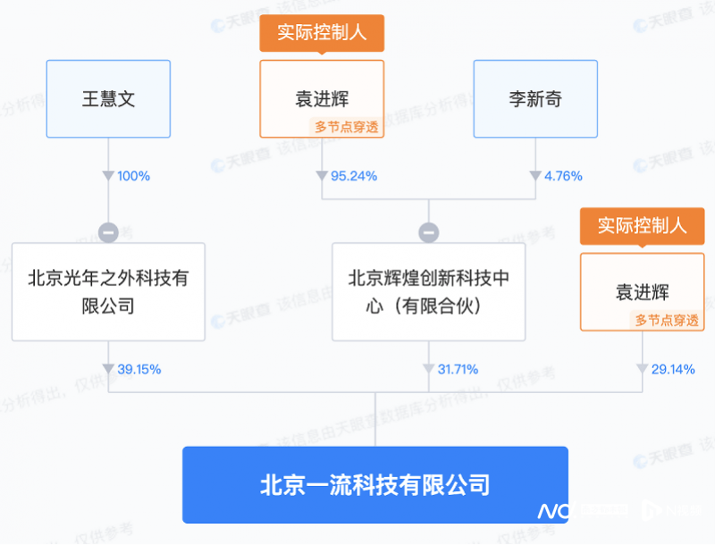 一流科技的股权结构显示,除了王慧文的光年之外,第二大股东为北京辉煌创新科技中心,持股比例为31.71%,第三大股东为袁进辉,持股29.14%。据悉,袁进辉为一流科技创始人兼CEO,此前为微软亚洲研究院研究员,也是360搜索的早期成员。因北京辉煌创新科技中心的执行事务合伙人也是袁进辉,因此,一流科技目前的实控人依旧是袁进辉。此前,有消息称王慧文的光年之外与一流科技是达成的并购意向,交易以换股形式进行。