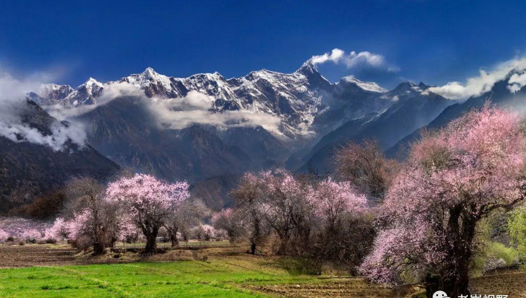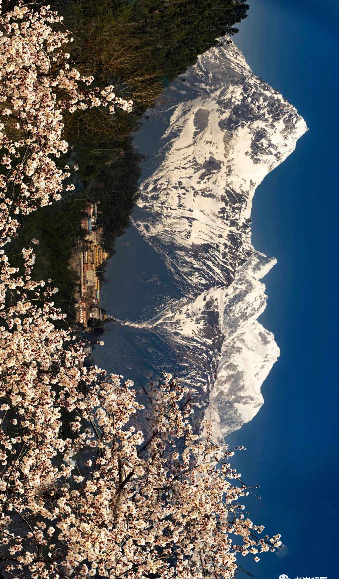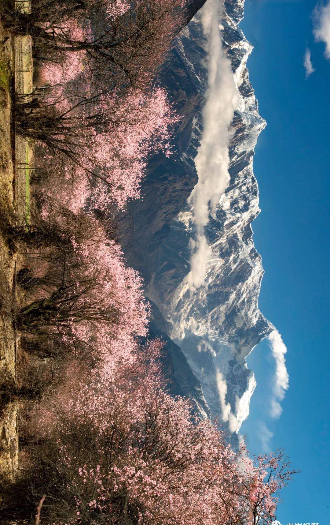(请横屏。绽放的桃花源遇见南迦巴瓦峰的旗云,可遇不可求的圣境。摄影@邯郸老崔)