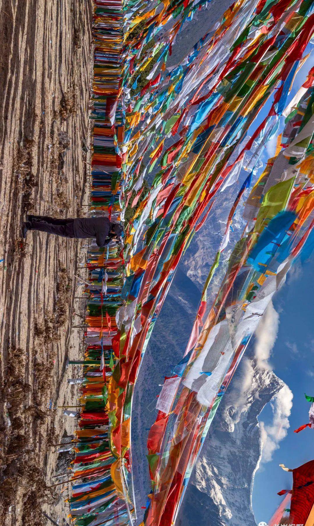 (请横屏。秘境达林村,风动的经幡与南迦巴瓦峰的旗云。摄影@邯郸老崔)